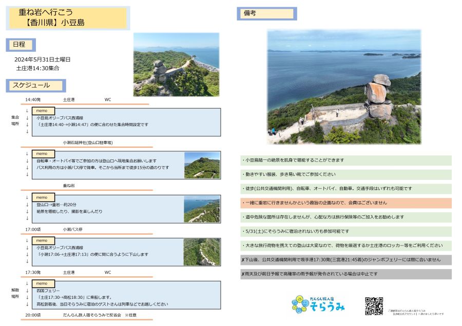 瀬戸内海に浮かぶ小豆島のワンダースポット 「🪨重岩に行こう🪨」 を開催します。小豆島随一の絶景を肌身で感じませんか。一緒に行きましょうという趣旨の企画ですので、会費はございません。公共交通機関利用でも行く事ができます。