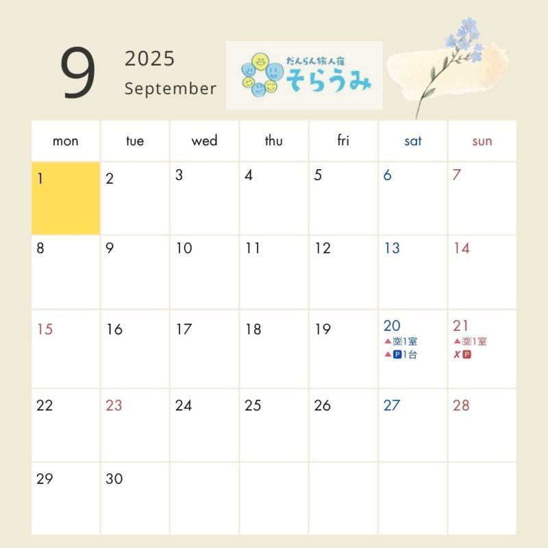 現在宿泊のご予約を承っております【令和7年(2025)8月・9月・10月日程】の空室状況のお知らせです。