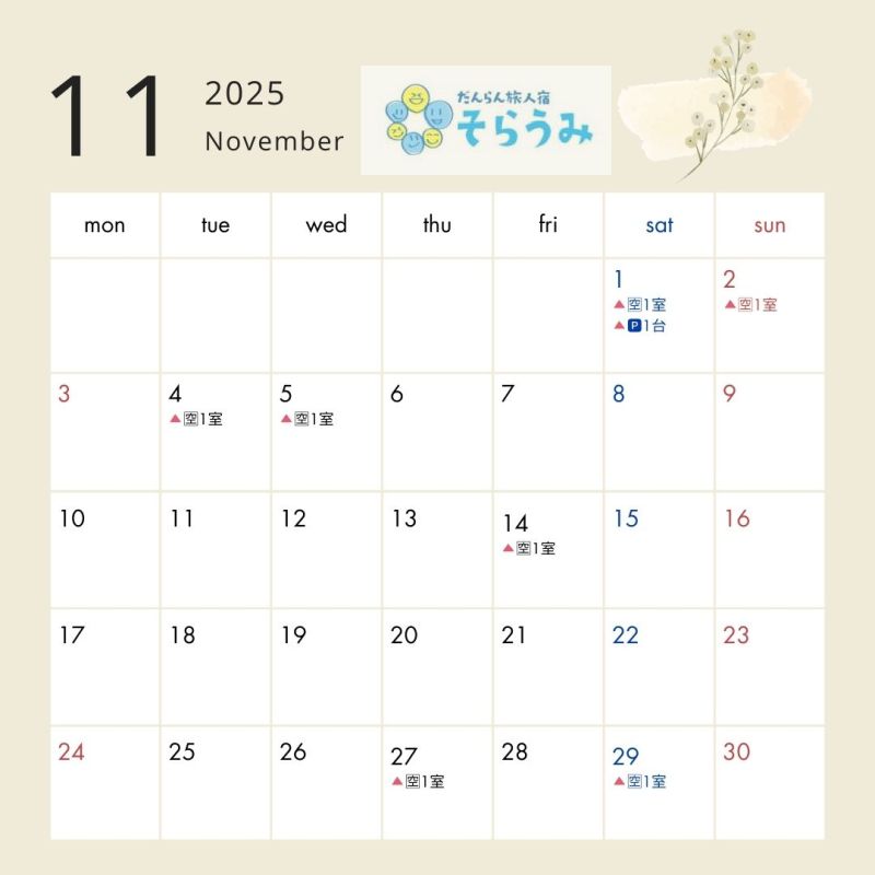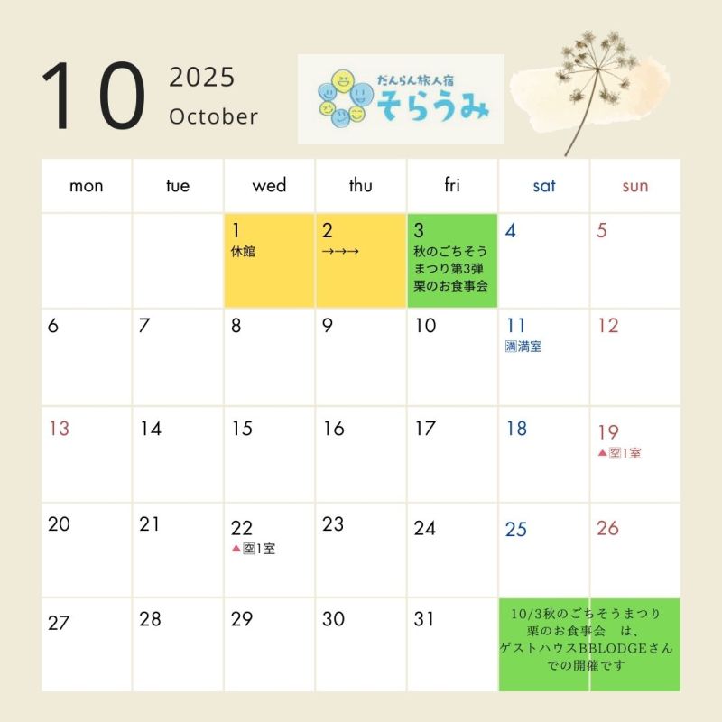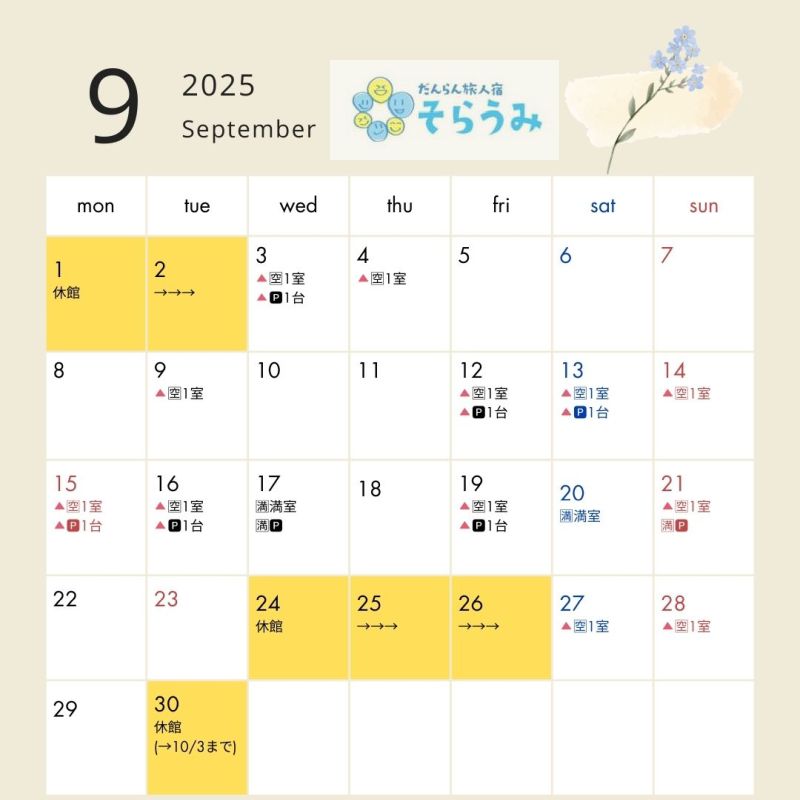 現在宿泊のご予約を承っております【令和7年(2025)9月・10月・11月日程】の空室状況のお知らせです。