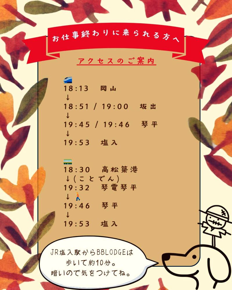 公共交通機関利用で岡山駅および高松駅からの接続ダイヤです。